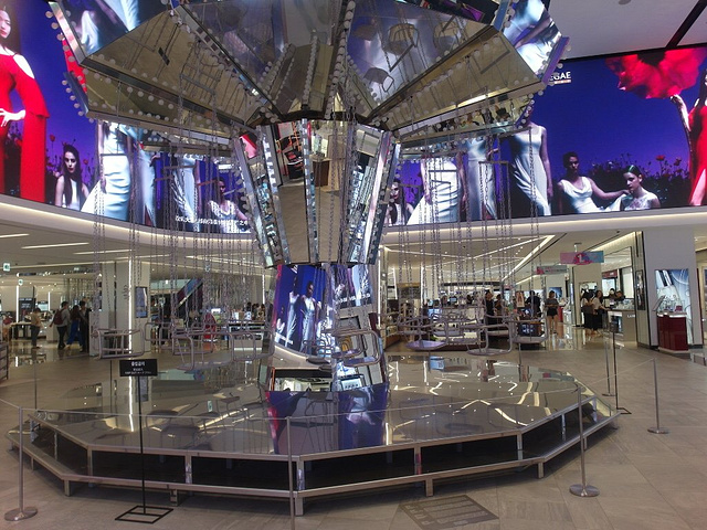 10楼雪花秀专柜附近又有一个拍摄地~这是呢就不是鬼怪的拍摄地了~与其说是拍摄地,其实它是拍摄时用的道具~这个旋转秋千是蓝色海洋传说中全智贤坐过的秋千~超级神奇一个百货店~里面居然还有一个这么大的秋千哈哈~真是个拍照的好地方。虽然很想上去坐,但是这个秋千只供观赏哟~虽然楼主体重很轻科科~