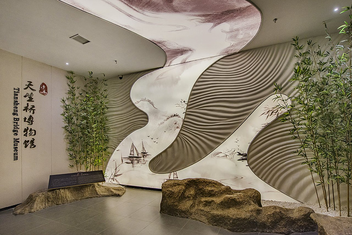 天生桥博物馆,为一栋三层框架结构建筑,是胭脂河天生桥旅游度假区的重要组成部分。建筑由南京大学建筑规划设计研究院的设计师主持设计。设计师以天生桥为意向,将建筑形体以桥的方式组合在一起,通过中轴对称的造型设置,以抽象简洁的手法设计布局,以简洁内敛气质体现出文化建筑气息,并突出建筑的地域性特征,使整体建筑风格简洁、庄重、大方。