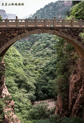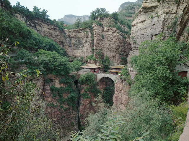 桥楼殿凌驾于峭壁之间,桥上建楼,楼内建殿,殿内三尊大佛。是中国三大悬空寺之一。从上往下看一阵眩晕
