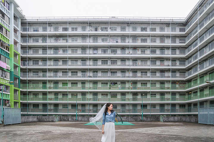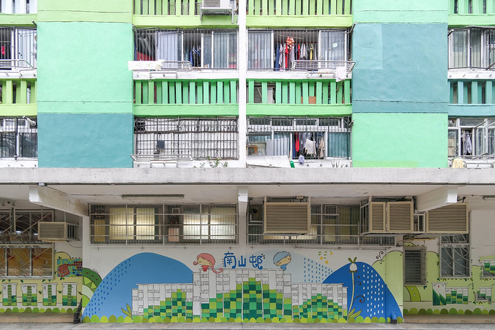 拥有40年历史的南山邨,绿色的主色调,依旧整齐的架构,中间空地上有三个半圆形的旧式游乐设施,三面被大厦环绕,密密麻麻的住户是香港最真实的写照。
