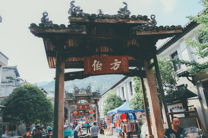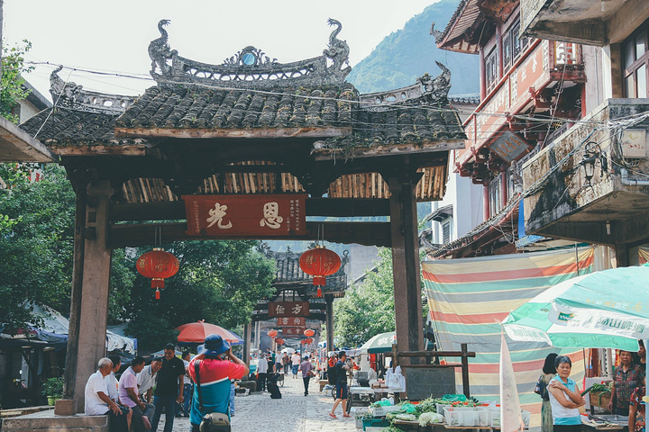 第一个走过的牌坊名唤“方伯”。清晨至此,这里的生活气很浓,街道上人来人往,卖蔬菜的、卖肉的、卖水果的应有尽有,更多的是一张桌子、一个板凳,就坐着吃面的场景。好像很久没有感受过这么有烟火气的地方了,平日在家的清晨我似乎都在睡梦中度过,出门的清晨又大多早起就奔向景区了,实在没有机会接触到这么生活的一面。所以难得来此处走一走,甚好。