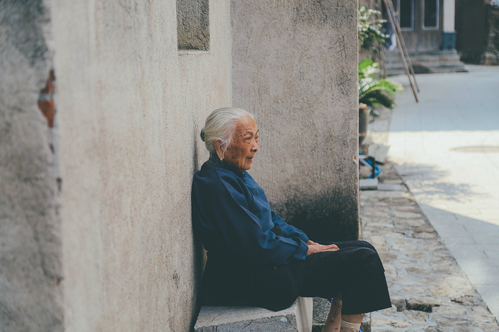 头发花白的奶奶身着蓝衣坐在房屋下,看人来人往,回忆着自己的青葱岁月。