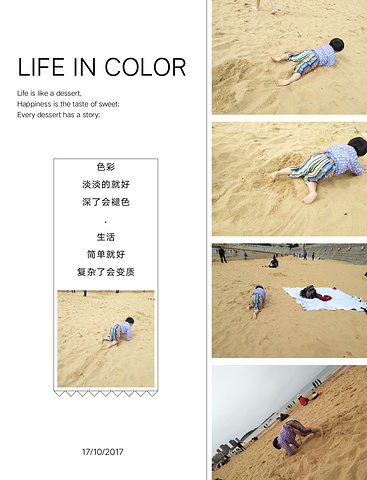 今天全部步行,海边玩沙子,山大吃饭,主要是玩沙子,玩够了吃饭回住处休息,总体来说国际浴场的沙子比青岛的沙子好,浴场的沙子干净,无杂质,没有小贝壳或者贝壳碎渣,也找不到小石头,就是挖很深很深,沙质都一样,沙比盐的颗粒小。以前去过北海,北海的沙子是白色的,威海的沙子是红色的,两者的沙质一样很细很软很舒服。强烈推荐威海国际浴场。