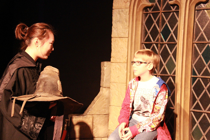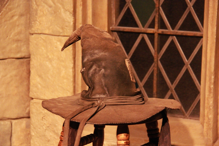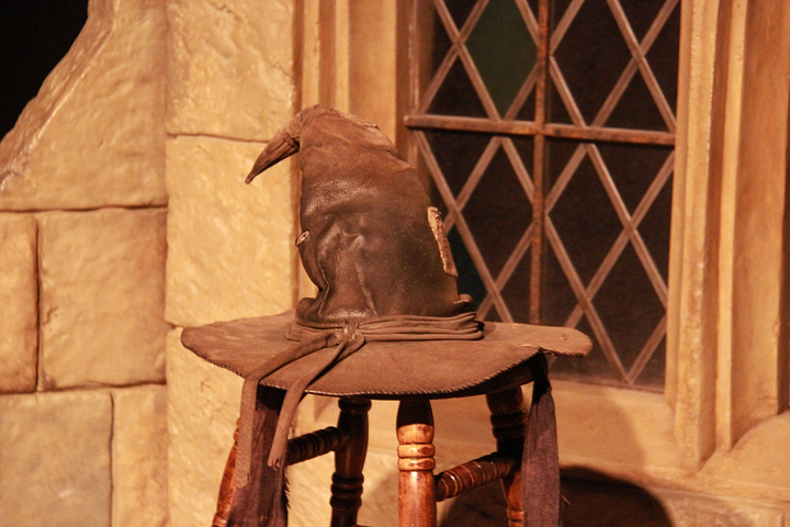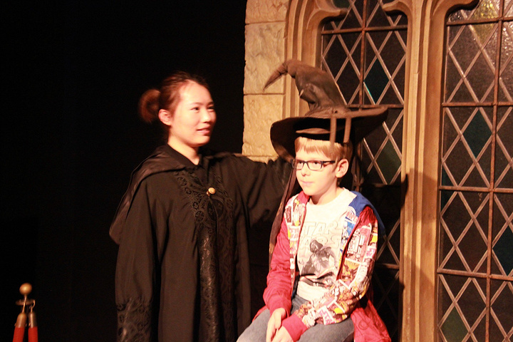 看完了投影,下一个厅是一个互动大厅,前面摆着一把凳子凳子上放的是什么?你看过哈利一定知道,是分院帽,工作人员喊游客上去互动,当然我和宝贝首当其冲哈哈,不过我选的是斯莱特林而她选的是格兰芬多,之后上去的是一位国际友人,一位来自欧洲的小正太,好帅的!