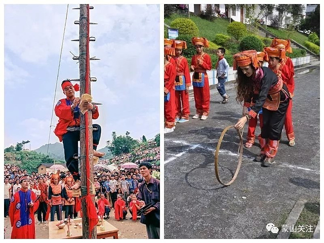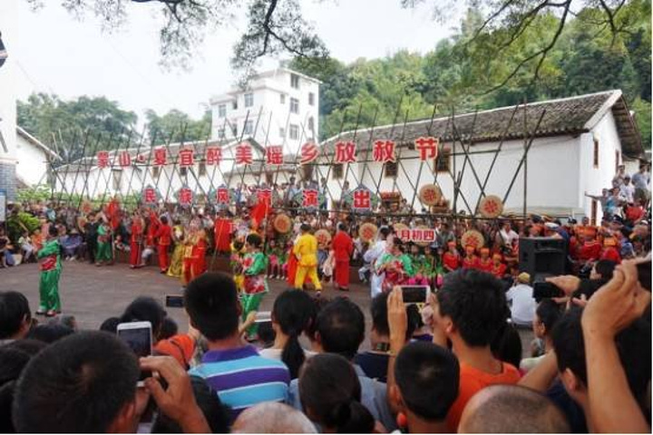 醉在民俗。农历八月初四是夏宜瑶族乡千百年流传下来的传统民俗节日,热烈、神秘而圣洁。很久以前,瑶乡青年男女在这一天精心打扮,满心欢喜相聚古榕下。遇到心仪对象,青年男子争相一展歌喉,青年女子含羞唱和,相爱的人们以歌相会、倾诉衷肠。歌为媒,树为证,美妙歌声里许下一生承诺。随着时代变迁,夏宜的农历八月初四已演变为瑶乡盛会。现在,瑶乡同胞在这一天穿上节日盛装云集圩镇,鼓乐齐鸣、载歌载舞。看,神情兴奋的瑶家阿哥、面带娇羞的瑶家阿妹带着富有瑶乡特色的“嫁郎、嫁女”婚嫁民俗表演来了;听,嘹亮的山歌唱得开怀,人们你来我往地即兴对歌呢!这一边,滚圆环、打陀螺、顶竹杠、抛绣球等瑶族趣味竞技传来阵阵欢笑,快乐时光在笑声中重现。