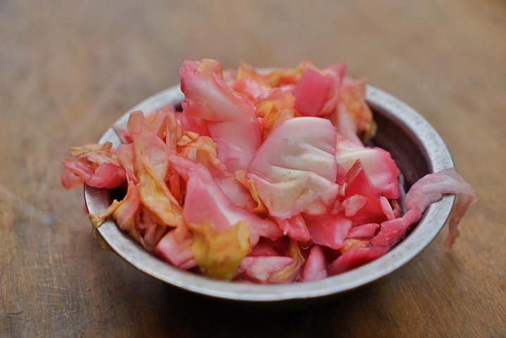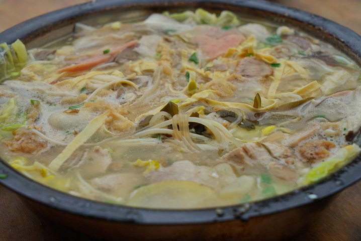 秘制的汤锅里,加上白肉、酥肉、肉丸、粉丝、豆皮等等,可以根据个人喜好随意添加。等了一会儿,热乎乎的汤锅就上桌了。同时,会附赠四川必备的泡菜和蘸碟。
