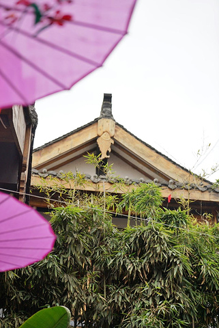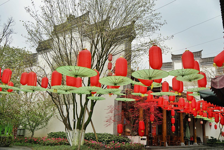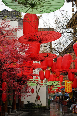 古街上挂满了红色的油伞,和灯笼。古色古香。