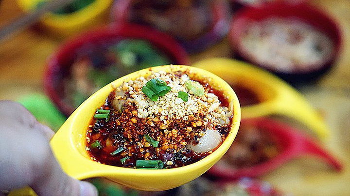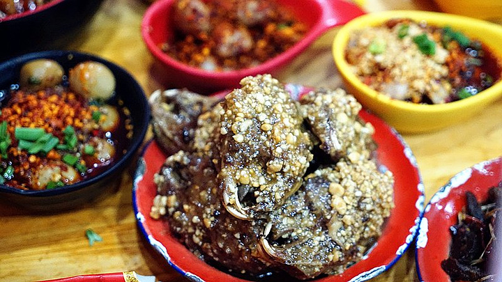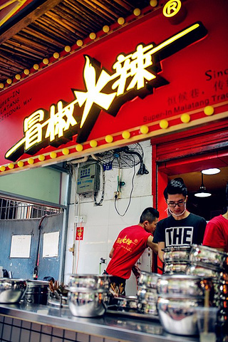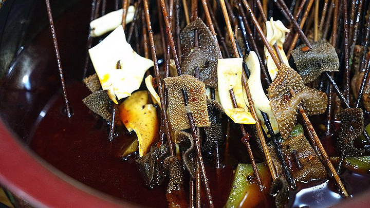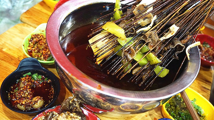 但是串串确实地地道道的四川发明。串串像是火锅的“轻松版”,因为想要三五朋友聚会,吃不了那么多菜,但又想把每种味道都感受一下,于是就把菜弄成小分量,串在竹签,放进翻滚的红汤中,几分钟后捞起,用筷子轻轻一捋,菜就纷纷掉落香油碟中!吃起来没有火锅那么气派,但是却是可以吃的更悠闲。