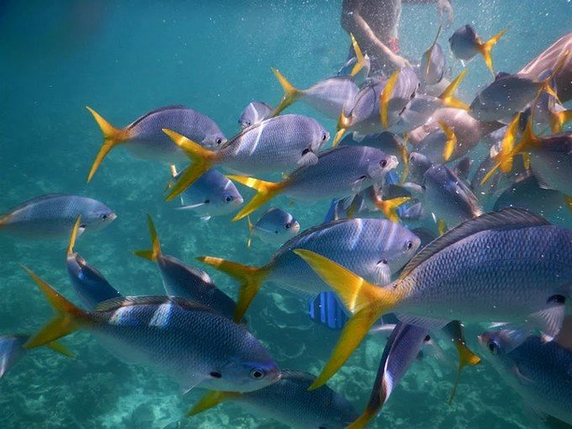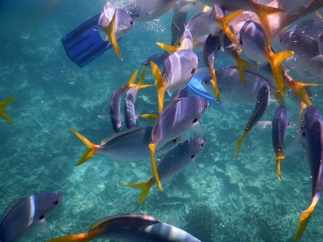 这里是美人鱼水道,有很多小鱼。各种各样的,拿着下面包球来喂小鱼。