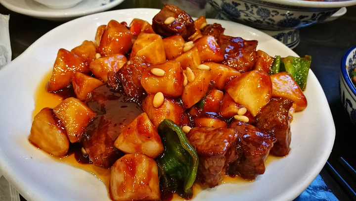 松子牛肉炒年糕:牛肉很大块,年糕也很软糯,裹着甜甜的酱汁,觉得年糕更胜一筹,当然牛肉也很好,一点也不老。