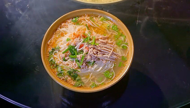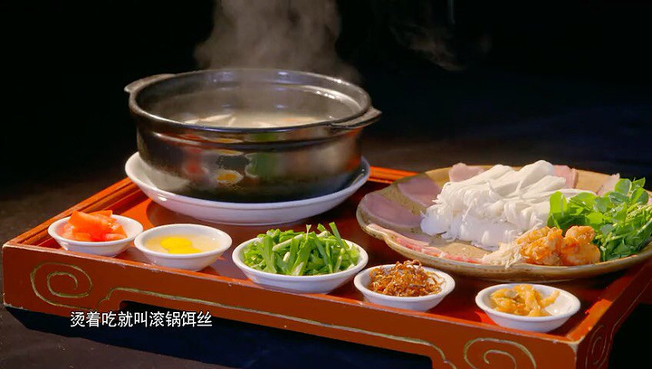 腾冲有着最丰富的饵丝烹饪方法,用高汤煮着吃的叫大加工,炒着吃叫大救驾,烫着吃就叫滚锅饵丝。