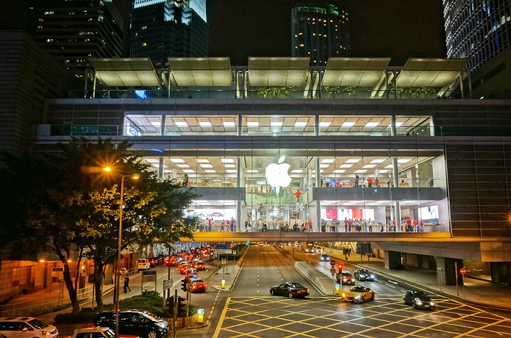 在ifc通往码头的桥上,可以看到中环最大的apple store,霸气侧漏的外观,中间白色的苹果logo特别耀眼,通过透明的落地玻璃可以看到里面客似云来。