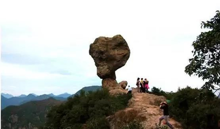 最奇特的就是美女峰了,为浙中著名奇石,海拔905米,于1.5亿年前由中生代燕山运动强烈的断裂、挤压而成,又称香炉石、颠倒壶瓶。她如一朵蘑菇云冉冉升天,又如一盘头美女翘首西望,给人以无尽的遐想。