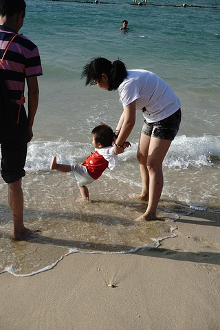 看完表演直接沙滩走起,本来风太大了,就打算让桃子自己玩沙,我和孩他爸直接海滩上走起,有好多拍家庭照的,我们两个在海滩边走走看看,捡捡怪石头,看看大海,