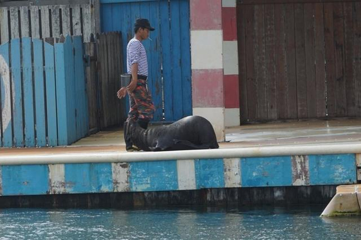到岛上直接去换下午1:30分的海豚表演,首先出场的是海豚,六只小海豚很是卖力的表演着,一会翻转跳跃,一会顶球