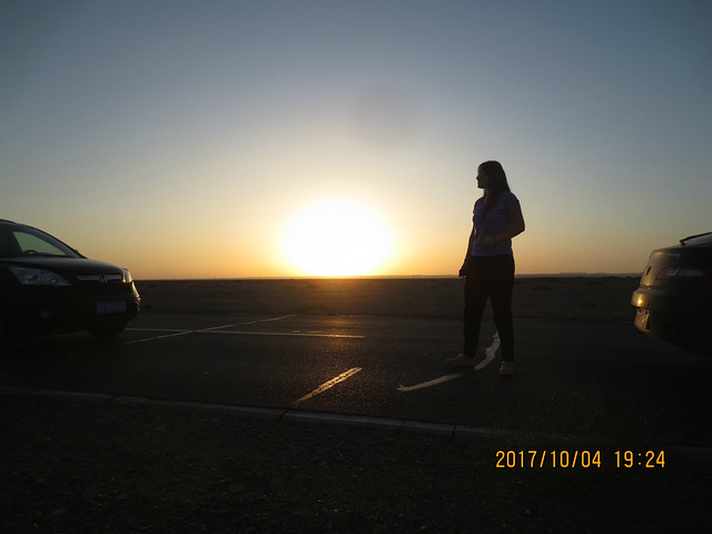 加满油就抓紧往卫星发射基地走啊,想看看那地方有住的地方没,因为在网上怎么查也找不到这里住的,所以出发前就把帐篷带上了,有备无患。这里是军事地区,路的两边全是荒漠,望不到边,太阳快落山了,前面出现交通事故,造成了大面积堵车,半小时后才通车,不过落日还是很漂亮的