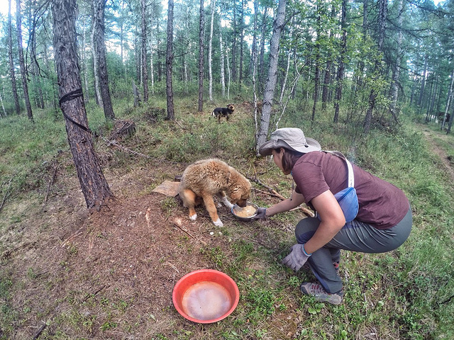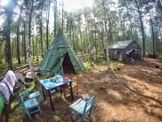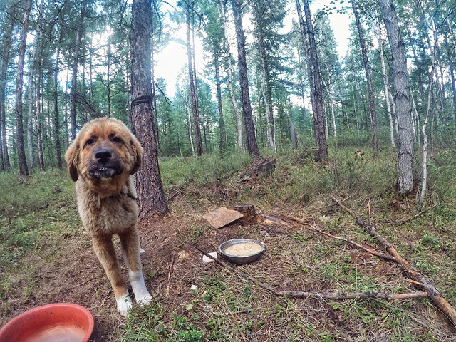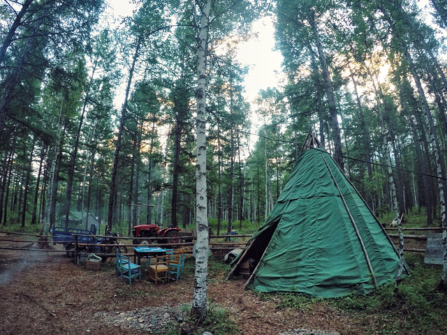 几只毛茸茸的大狗,因为担心吓到来参观的游客,可怜的被栓在树上。但是它们依然忠诚,每当有个风吹草动都会不停的狂吠,有时也为远处歌唱的狍子和声。