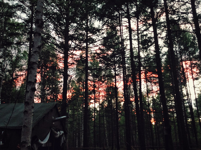 中才会出现的大兴安岭、鄂温克人、撮罗子和驯鹿活生生的展现在眼前时,它们陌生而又熟悉,心中不免会怀疑其中的真实性。而此时黄昏降临,猩红色的晚霞努力透过繁茂的枝叶,将这一切映照出斑斑点点的红色,增添了更多的戏剧效果,此时终于发现:我们确实走进了一个童话世界!