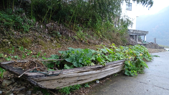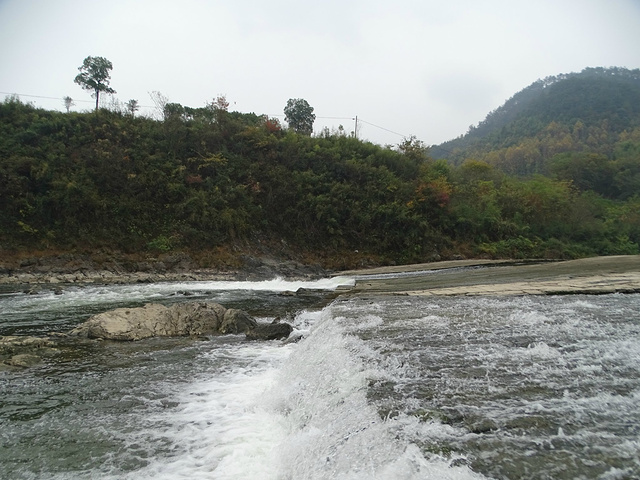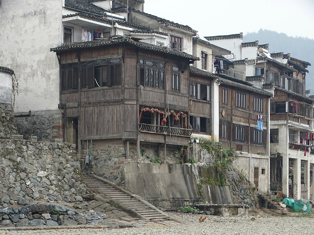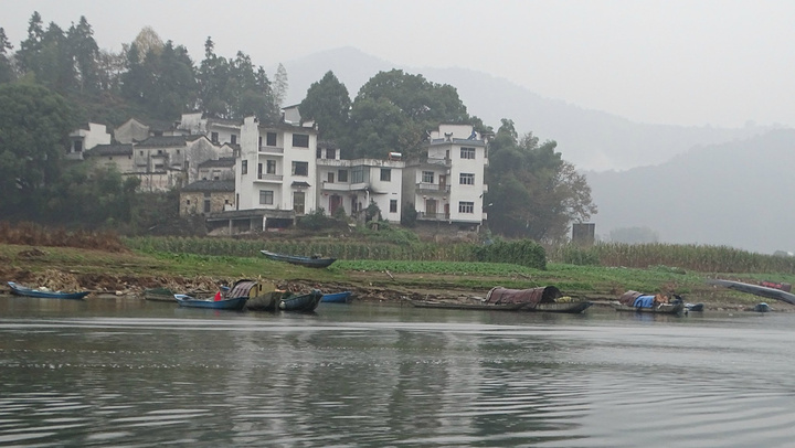 拦河坝两旁,有古老的渡江码头,古朴的村落,沿江铺设的一条一米多宽的石板路,据当地农家老妇对我们说,可以通到县城(无法考证,这里离歙县县城还远着呢)。堤岸两旁,随处可见沿江居住的村民或用废旧的脸盆、塑料包装箱盛满泥土种植的姜葱蔬果。虽然已过中午,但少数尚未吃饭的村民家中仍在淡淡的飘出袅袅的炊烟。