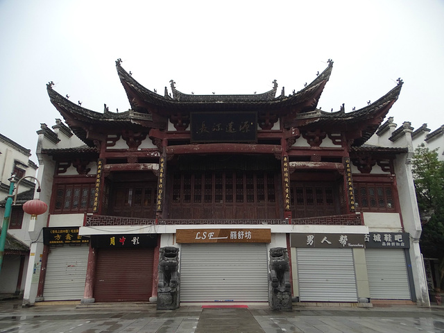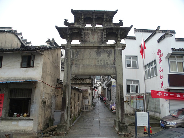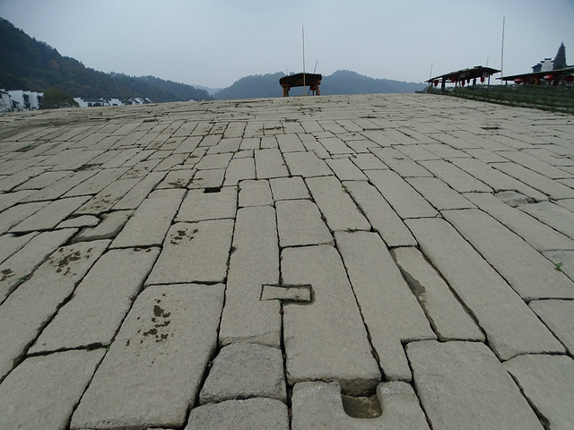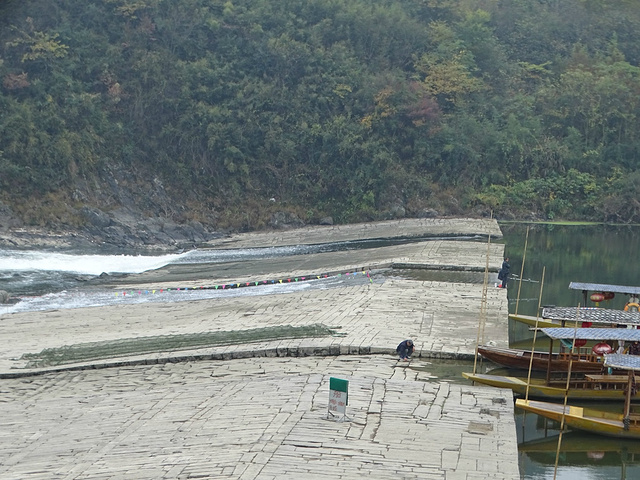 继续前行,来到了渔梁坝。渔梁坝是新安江上游最古老、规模最大的古代拦河坝,是全国文物重点保护单位。坝长138米,底宽27米,顶宽4米,全部用清一色的坚石垒彻而成。它们垒砌的建筑方法科学、巧妙,每垒十块青石,均立一根石柱,上下层之间用坚石墩如钉插入,这种石质的插钉称为元宝钉。这样,上下层如穿了石锁,互相衔接,极为牢固。每一层各条石之间,又用石锁连锁,这样上下左右紧联一体,构筑成了跨江而卧的坚实渔梁坝。坝中间有开水门,用于排水。