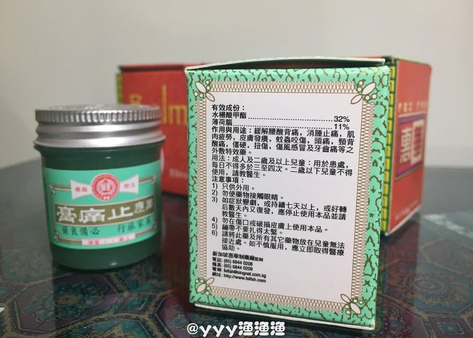惠华万应膏:新加坡本土品牌止痛膏。外用。有效成分:冬绿油、薄荷脑。作用与用途:舒缓关节痛、风湿强痛、肘臂痛、腰酸背痛、偏头痛、颈痛。这个是我们离境时在樟宜机场的意外收获。售卖规格都是一盒三罐装,不零卖,犹豫要不要买的时候就在肩颈处抹了一点儿试用,抹上之后有一点点清凉有一丝丝热辣,很舒服,适合伏案工作者缓解肩颈不适,就收了一盒。