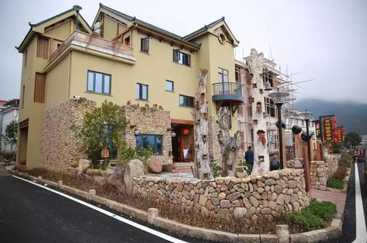 民宿坐落于村内道路的拐角处,暖黄色的外墙,石头堆砌的围墙还有树桩点缀的街角小品,透露着主人的丝丝用心。