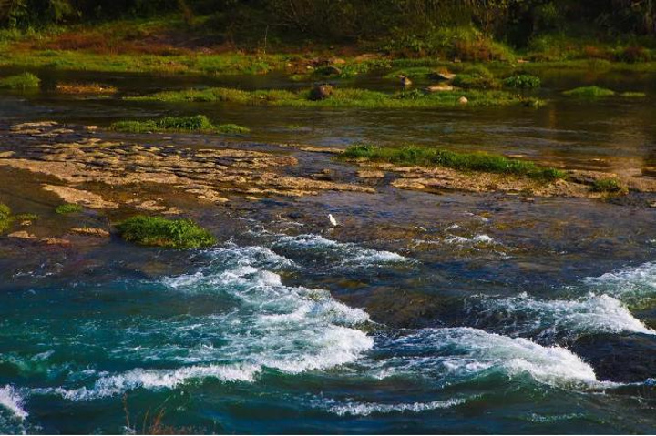 沿着岩头段的木头栈道前行,脚下缓缓流淌的就是梅溪,手边是俊秀嶙峋的紫岩石群,堪称奇特,颇为壮观。周围的景色融合在一起更加美得不可方物,简直是在画中行走。