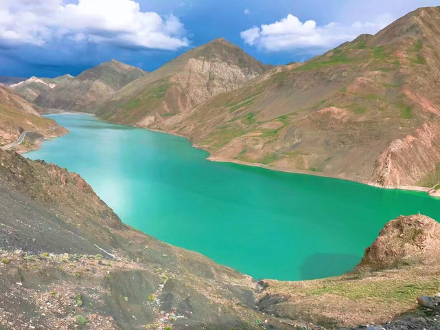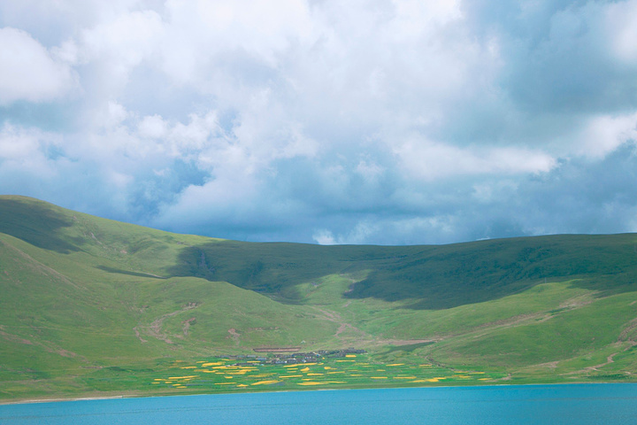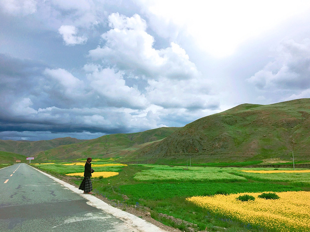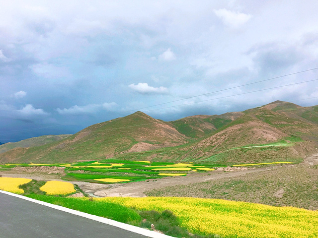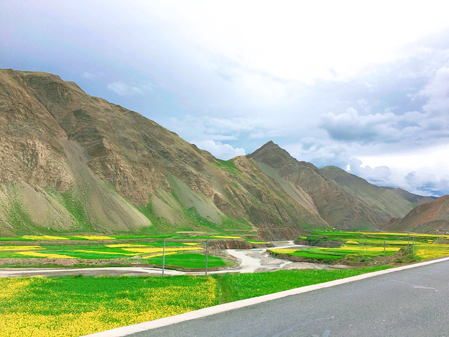 上到极冷的山顶,接下来继续走着一路油菜花青稞地,邂逅了不知名的翡翠色小湖和深奶绿色的满拉水库;到了江孜古城,两旁的油菜花更美。