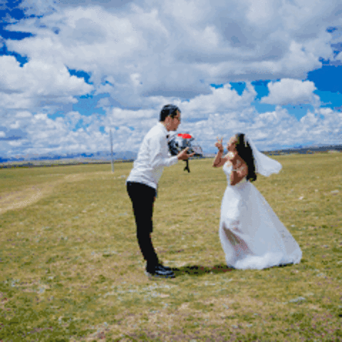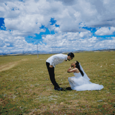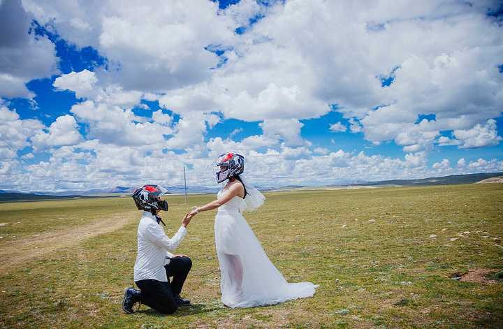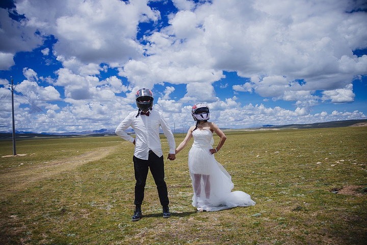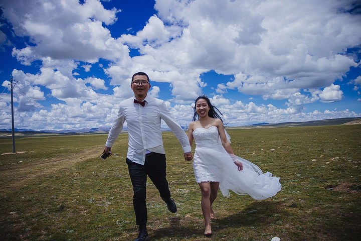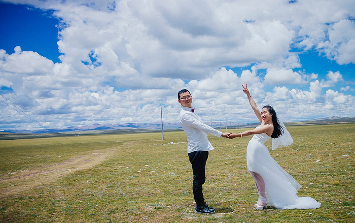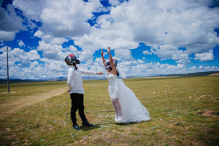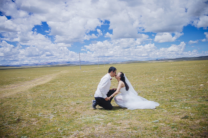 一直嚷嚷着要在大草原上拍一组婚纱照的木子木木夫妇终于决定在即将驶离西藏境内的最后一片大草原———那曲高寒草原上拍一组圆梦。于是乎,随便找了片平的,就开始卸行李,换衣服,支三脚架……速度惊人但却无人可惊,因为除了有过路的车车外,你根本见不到人来偷窥你换衣服,一点不用担心走光,也一点也不用担心会害羞,更不要担心有好心的路人甲走过。除了蓝天白云青草地外就只有木子木木和小黑。那就high吧,前方高甜狗粮来袭哦……