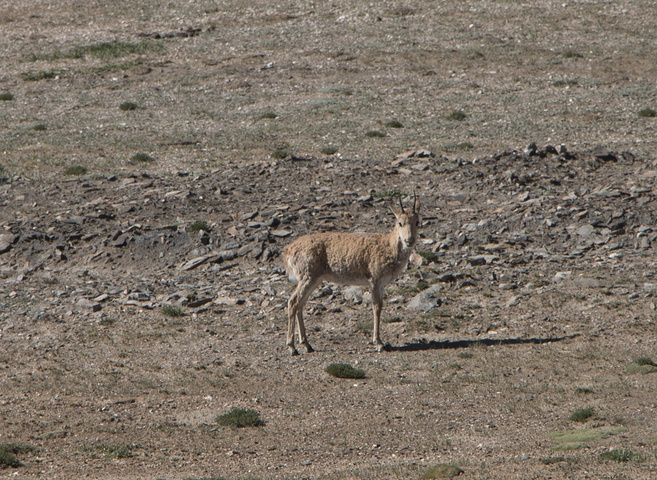 第一次看到铁路高架桥下面的一大群,远远的拉近尽头排到了几只。第二次就在隔的特别近的路边的空地上躺着,但是司机木木专心开车,速度太快,没有停下来看看。第三次我们热情的给对面骑行的朋友打招呼时,他提醒我们藏羚羊,路边的湖边躺着一群悠闲的晒太阳的藏羚羊,依然是因为司机太专心没拍。第四次,远远的落单的一只,当我拿起镜头走过去时,它好像很害怕的跑了起来,但是看我站在原地并没有要追逐伤害它的意思,他便停下来看着我,就这样远远的看着,仿佛看到了人与其的和谐共处,看到了再也没有伤害的可可西里,相信志愿者们的努力和人们的良知已经让可可西里不再流血流泪。