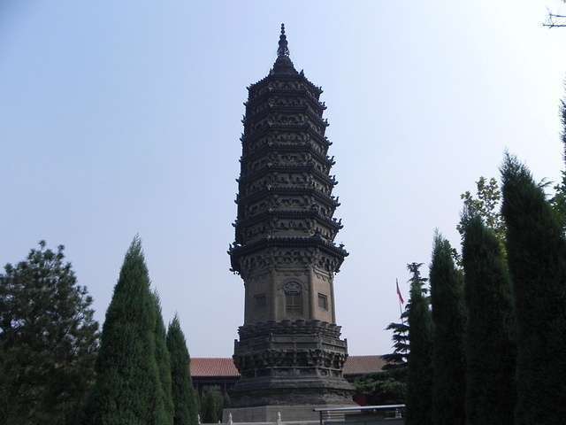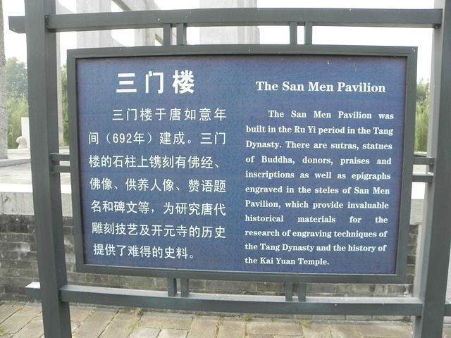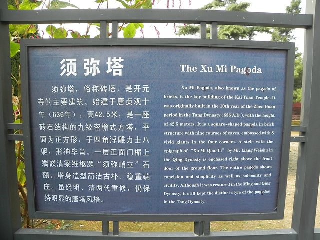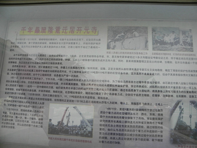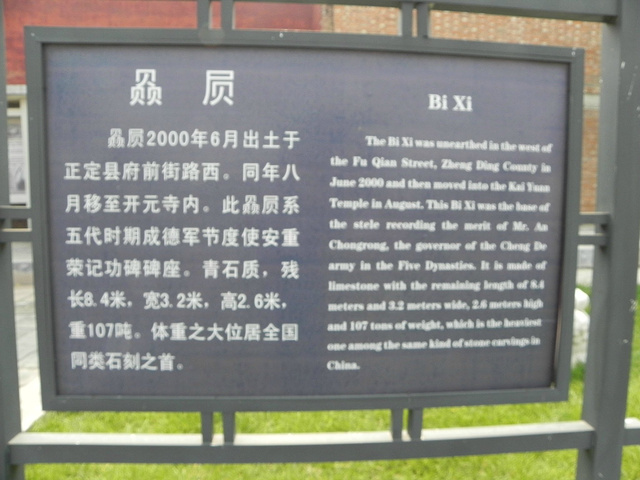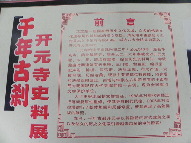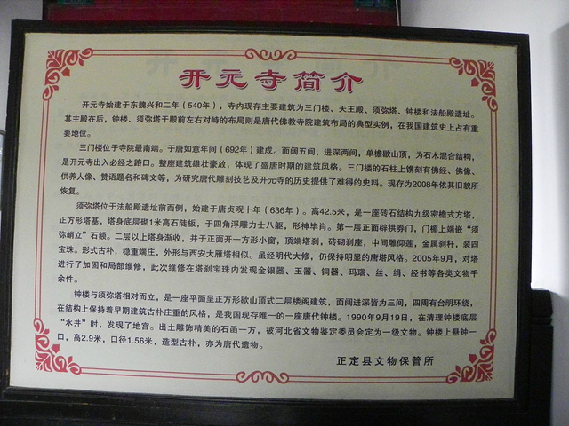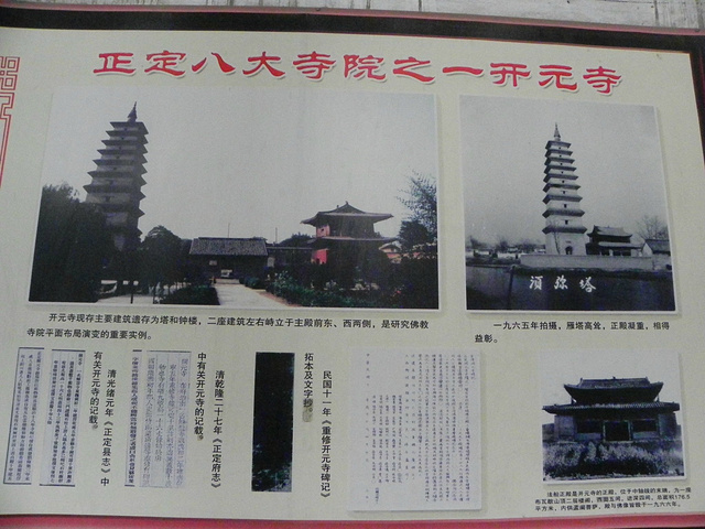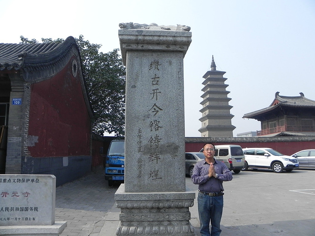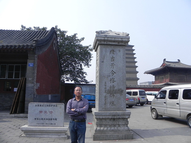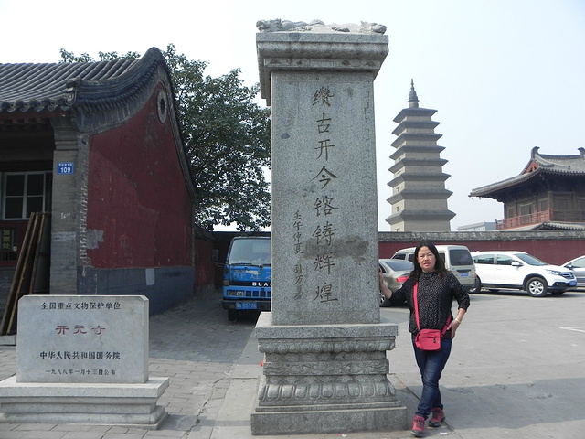 正定开元寺位于正定常胜街西侧,原名净观寺,始建于东魏兴和二年(540),隋开皇十年(591)改名解慧寺。 唐开元二十六年(738)奉沼改今名。现存的建筑却是显著的唐代风格。与其他寺院的布局不同,开元寺并非采用的对称布局,而是塔和钟楼并列而立,反映了佛教寺院建筑从早期以塔为中心向晚期以殿为中心的过渡情况。至清后期,因年久失修,寺院废毁,殿堂塌落,仅存钟楼和须弥塔。 钟楼为砖木结构的二层楼阁式建筑,平面呈正方形。面阔、进深各三间,建筑面积135平方米。单檐歇山顶,上布青瓦,通高14米。其大木结构、柱网、斗拱都展示了唐代建筑艺术风格。甚至上层木构件还有相当部分保持了唐代原貌。钟楼是一座两层楼阁,可以登上去,但台阶实在陡峭得很。在二楼可以看到屋顶的木结构和那口大钟。钟楼的屋檐四角也悬有风铃,和正定的其他几座寺庙一样,这里的风铃的铃舌也是四瓣心形的,非常漂亮。 这是河北省现存年代最早的一座木结构钟楼,也是北方时代较早的一座。1988年列为全国重点文物保护单位,并落架重修。钟楼上挂铜钟一口,高2.9米,口径1.56米,厚15厘米,造型古朴,为唐代遗物。 坐在树下看人来人往,日出日落。浮世如梦,跃然心头。 行人匆匆,表情各异。人生的喜怒哀乐,好似广告,轮回不息。我早已看淡这些,可眼前这些人却乐此不疲。 相聚的人欢呼相拥,分离的人挥泪不语。这些也层层不尽。不忍打搅他们,我只有默然静观。 。 2000年6月在正定城内府前街出土了一巨大赑屃(bìxì)残碑基座,长8.4米,宽3.2米,高2.6米,重107吨。赑屃为龙生九子之长,貌似龟,有齿,力大,好负重。因此其形象经常出现在石碑之下。安置在开元寺里的这座赑屃据说是国内最大的一只,鼻孔象猪,昂着脑袋,形象笨拙而可爱。有关专家初步考证,为后唐遗物,距今约1200余年,是研究我国后唐至五代时期历史的重大发现,具有极高的文物价值,是国内罕见的艺术珍品,堪称天下第一。现已移至开元寺内,供游客观瞻。 赑屃旁边还有几块五代的残碑,碑文还非常清晰,字迹飘逸清秀。 开元寺的草坪里全是三叶草。 开元寺古朴雅致,处处闪烁着劳动人民智慧的结晶。1980年,开元寺进行大规模重修,千年古刹又重放光彩。每天,前来朝拜旅游的海内外人士络绎不绝,不胜其数。 须弥塔,又称雁塔,坐落于钟楼西侧。塔身建在高约1.5米的正方形砖砌台基上,塔平面为正方形,密檐九级,举高39.5米,塔身第一层较高,下部砌石陡板一周,各面两端均浮雕一尊雄劲有力的力士像。石腰线以上全部由青砖砌筑。正面辟石券门,门框刻以花瓶、花卉图案,门循浮雕二龙戏珠。门楣上端镶嵌长方形石匾,上面镌刻“须弥峭立”四个楷书大宇。每层砖砌迭涩檐,四角悬挂风锋。塔身宽度自第二层开始收缩,外观清秀挺拔,简朴大方,颇似西安唐代小雁塔,是叠涩出檐塔的典型作品。塔内第二层上部原作木斗八藻井,惜已毁坏。今塔内呈空筒式,内壁垂直,上下贯通。第二层以上的八层,虽然各设一方形小窗,但无台阶攀登。 须弥塔是正定古城“四塔”之一,是我国建筑宝库的珍贵遗产。1956年列为省级重点文物保护单位。