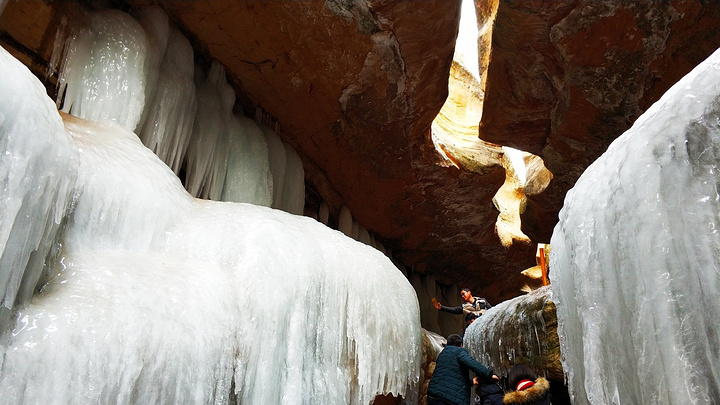 然后就继续往下走,俗话说“上山容易下山难”,而且那个地方本来就只有一个人通过的空间,我就加入了漫长的排队,身边排队的是几位从西安自驾来黑老锅的人,他们已经来了两天了,看样子及是两对中年夫妻,丈夫已经先下去了,在路的中间准备接身边的姐姐下去,姐姐告诉她老公,先把这个小美女接下去,然后其中一个哥哥让我踩在他的脚前面,这样不会滑下去,之后另外一个哥哥接到我,一样的方法把我继续往下送,底下的时候还有一个大叔在下面拉着我的手直到我安全着陆,旁边排队等着上去的人看着说,带着冰爪,有什么怕的,旁边的哥哥帮我回答,冰爪也很滑的。就这样我有惊无险的安全降落,内心的温暖不言而喻,这种感动,不是你躺在家里,或者上班的过程中就能体会到的,现在的人,永远对陌生人比身边的人更加友善,所以这个社会爱的力量,还在要在外出的过程中,更容易珍惜。