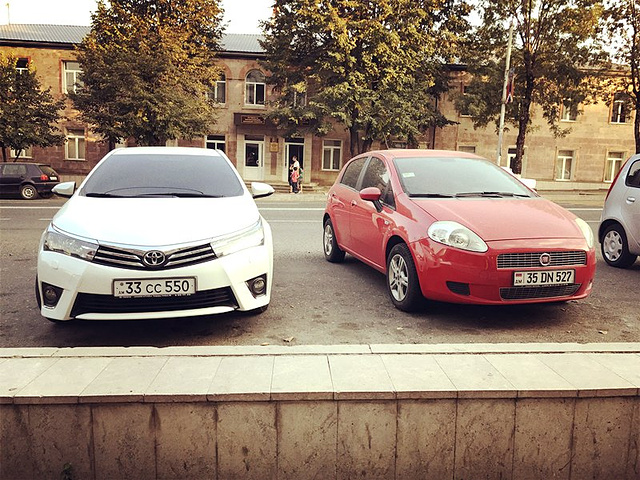 ▲左边是纳卡牌照的车,右边是亚美尼亚牌照的车。看出来不一样了吗?纳卡的车牌上,是没有国旗的。