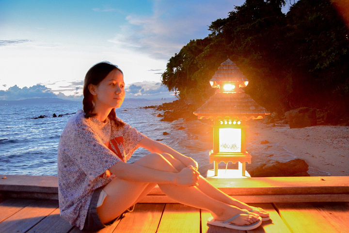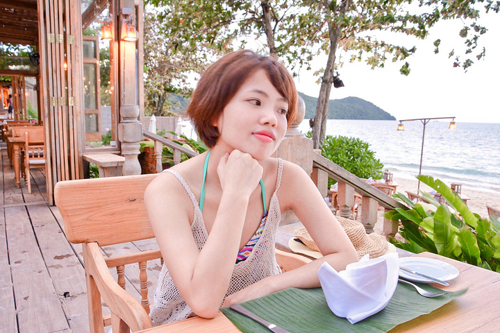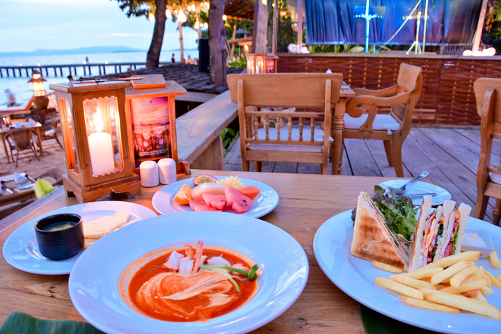 我们的晚餐是在By The Sea餐厅,餐厅分室内和室外,室内靠海滩的位子需要提前预约,看着桌子上都放着房号,我们只能落寞的在室外挑了个海景绝佳的位置,其实,室外很不错,雨季的泰国下完雨一点都不热,看着晚霞慢慢散去,海风伴着晚霞和大海吃着菠萝饭真的很美,而且它的菠萝饭竟然意外的好吃。