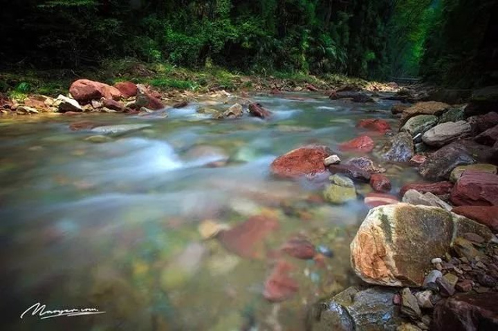 穿行在峰峦幽谷间,溪水明净,跌宕多姿,小鱼游弋其中。溪畔花草鲜美,鸟鸣莺啼,人沿清溪行,胜似画中游。所以被誉为"世界上最美丽的峡谷之一"。溪水透着一股仙味,莫不是仙女也经常来这洗澡,嘻嘻.....