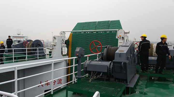 靠岸前。司机先下去车舱。那绿色的大铁板放下,车就可以开出去了。