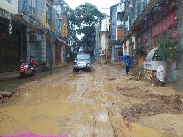 到双廊这一路都是倾盆大雨,总的也就拍了几张照片。还不得不后期做一下把雨水给去掉,一路开车很危险,因为雨天路面打滑,加上各种大车跑得很快。值得一提的是,到双廊还有一公里左右的时候,会有大妈拦路告诉你前面车开不过去,需要把车停她们这里,然后坐面包车每人十五还是二十来着给你送到双廊,这个千万不要信,前面说了双廊的确路很烂,但从镇口大树这里走上面就可以了。何况不怕累也可以传过去,咱们为啥要这么麻烦去坐她们的车呢?