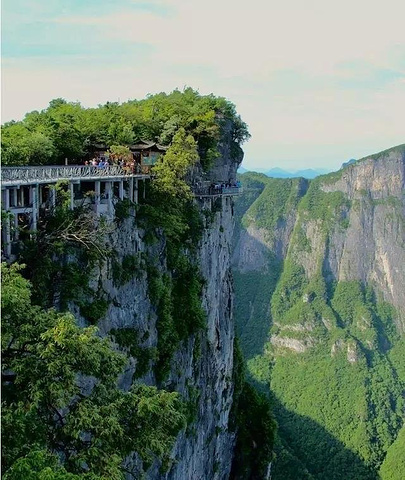 玻璃栈道:是天门山内的精华特色游道。西线栈道全长60米,先运营;东线栈道全长150米,后运营。栈道都建在悬崖峭壁上,道路全部用透明玻璃建成,走在上面,看到脚下的万丈深谷,胆战心惊之余,感受凌空行走的快乐。 在天气比较恶劣时,比如下大雨,玻璃栈道将可能被关闭运营。