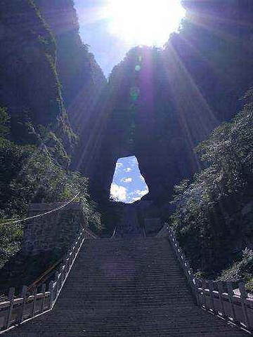天门洞:位于天门山国家森林公园内,是世界海拔最高的天然穿山溶洞,也是天门山最具有代表意义的景点。天门洞南北对穿,海拔1300米,门高131.5米,宽57米,深60米,拔地依天,宛若一道通天的门户。“天门吐雾”、“天门霞光”被人誉为举世罕见的景象奇观。1999年,俄国、美国、匈牙利、哈萨克斯坦、捷克、立陶宛六国飞行员架机穿越的山洞,创造世界吉尼斯纪录。