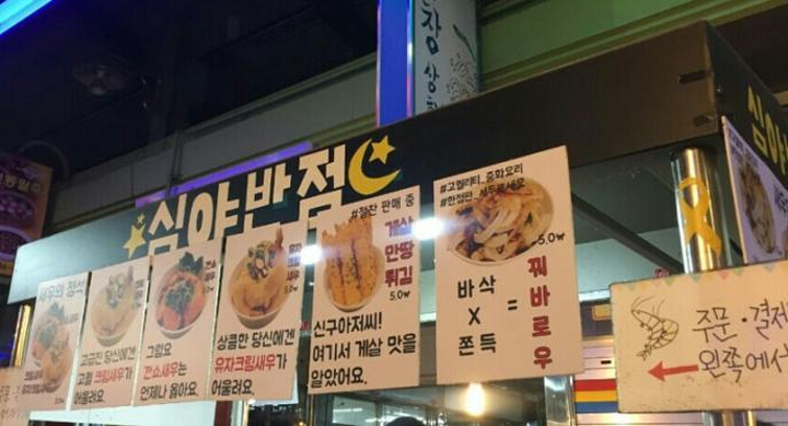 车停到停车场后,一进夜市入口就能闻到阵阵食物的香味儿。糖饼、绿豆饼、辣炒牛肠、鸡肉串、紫菜包饭、面疙瘩等等各种路边小吃应有尽有。每一个小吃摊前都排了长长的等待的队伍。
