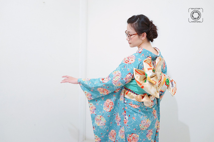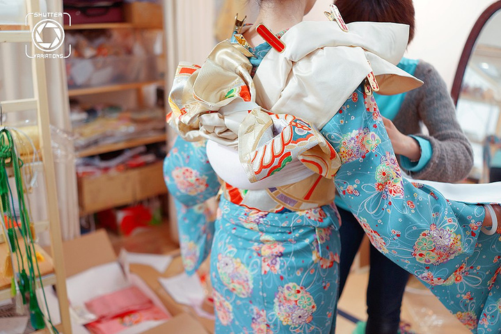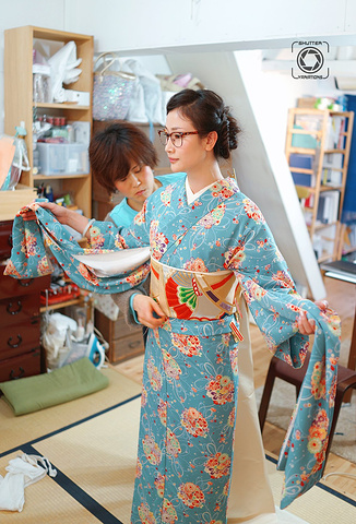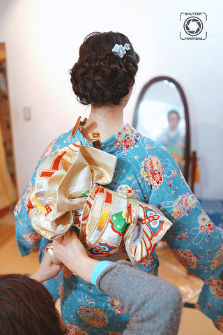 最后就是检查胸前和后背是否有折和松懈,有的话,往腋下这边拉平整。检查和服与长襦袢的中心线是否在同一位置。整体完成后用大镜子检查是否有差错,然后摘下领上的夹子。从后面看是不是超级美!