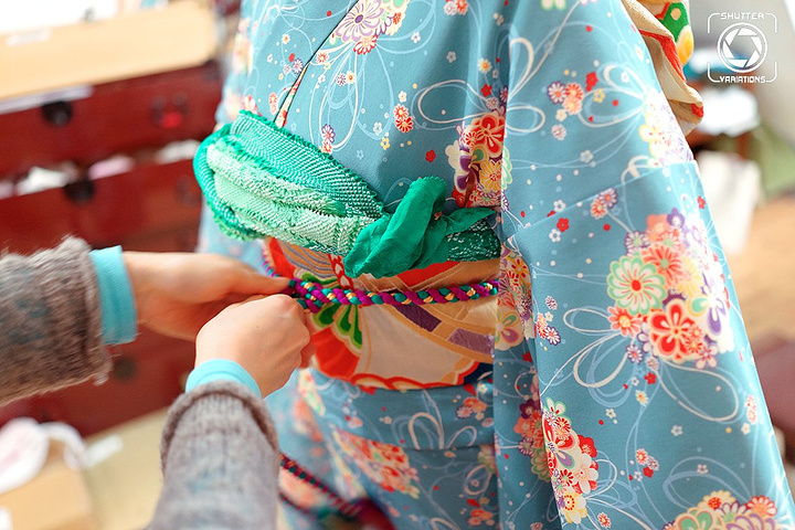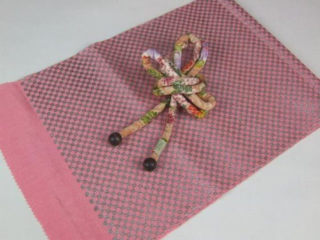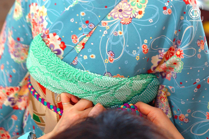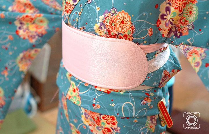 之后,还有一层漂亮的布包住带枕,被叫做带扬。他是一块长方形的布,作用除了在制作带结时能够固定和包覆带枕外,在装饰上也严格要求与和服、和服带配套。带扬的材料一般选用正绢或化纤,有的带扬上会有图案,有的会有扎染。(图中草绿色宽宽的那条就是)