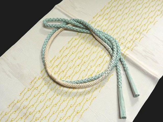 而带扬下面那一细紫兰色条型编成的带子就是带缔。带缔是长约1.5米的编织带,起到固定带结的作用,同时也要求与和服、带相配。被穿上前都是下面这个样子