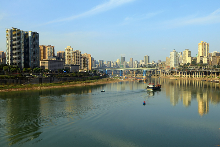 又尝试了其他几个位置拍摄后,忽然看到不远处的三号线,笔直的一条横亘在桥上,一旁的嘉陵江上泛着几条船,船只往前驶去,圈圈波纹荡漾开来,一派和谐静美之景。此情此景,突然想到一句话,不要为了追赶兔子而忽略沿途的美景。“轻轨穿楼”景象固然独特罕见,但眼前的美景也令人陶醉,不是吗?