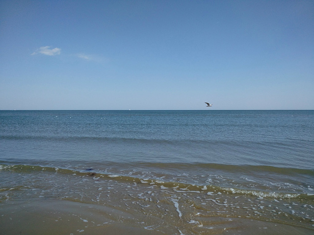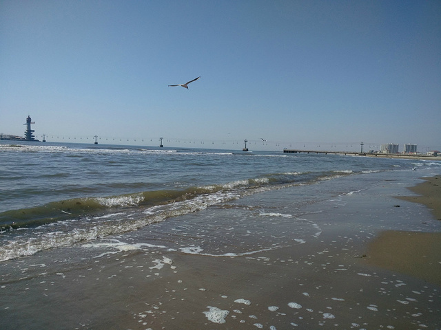 等我们到了海边的时候,发现海滩上好像也没什么活的贝壳和小鱼小虾什么的。于是就选择在海滩上站着,看海浪。海浪在风的吹动下,一股一股的向海滩涌来。有的时候风大一点,海浪竟能涌到我们所站的位置,然后我和女儿就开心的躲避海浪的追赶。感觉海浪就像长着脚的小动物似的,快速的向前跑着,追着我们玩。