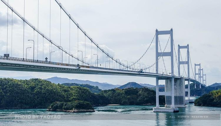 来岛海峡大桥是爱媛县的著名景点,是连接日本爱媛县今治市和濑户内海大岛之间跨海公路大桥,它跨越来岛海峡。大桥位于濑户内海入海口,桥下净空50米高,可通行海洋巨轮船舶。