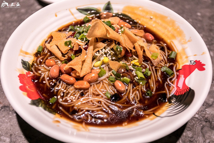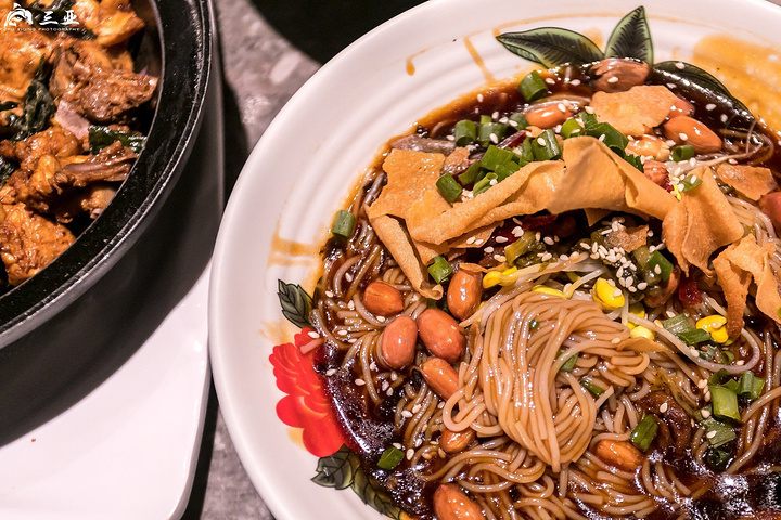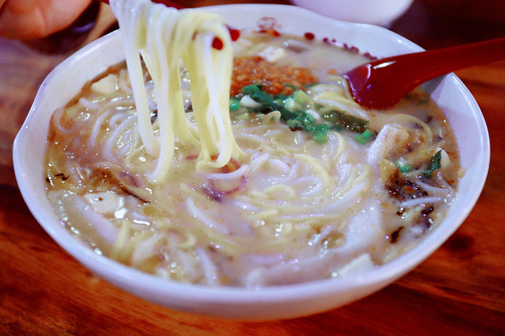 海南粉的粗细程度就更像面条啦,它的配料很多,油炸花生米、炒芝麻、豆芽、葱花、肉丝、香油、酸菜、竹笋等,正因为海南粉的细,加的料才能入味,比起前两者,海南粉还略微辣一点。