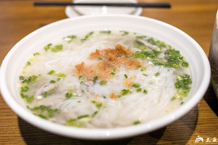 后安粉是万宁后安镇出产而得名,白色的米粉条白嫩晶莹,白如雪呀。我点的是一碗原味后安粉,没有加什么七七八八的配料,上面就缀了葱花和炸的像是油条碎,简单却又很清香,一般都是海南人的早餐必备,好吧,我是拿来吃晚饭的。