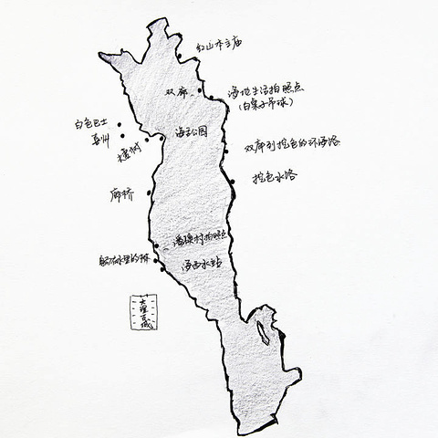 1、白色巴士;2、夫妻树;3、海舌公园;4、喜洲;5、廊桥;6、红石本主庙;6、双廊;7、海地拍照点;8、双廊到挖色的环海东路;9、挖色水路;10、海西水站;11、大理古城。