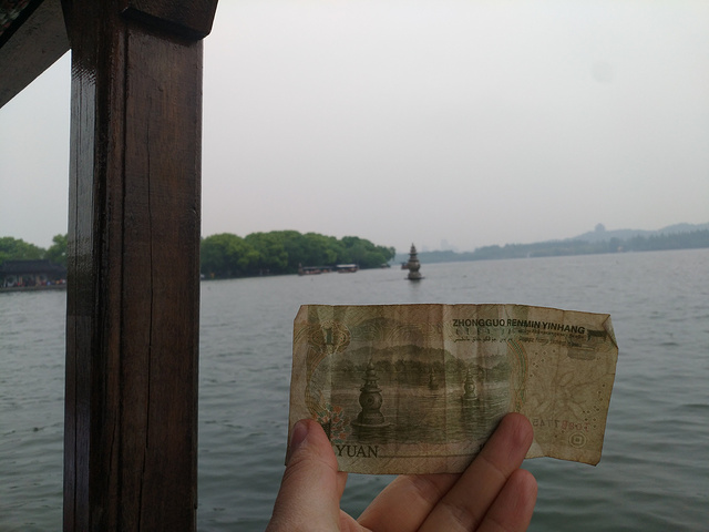 三潭印月,和1元人民币的图案是一样的,远处的陆地是小瀛洲岛,坐电动船可以登岛